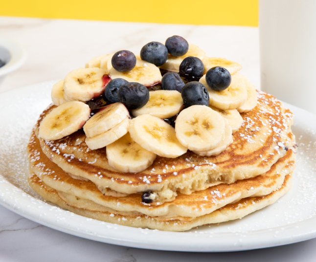 De délicieuses crêpes empilées aux myrtilles et aux bananes.