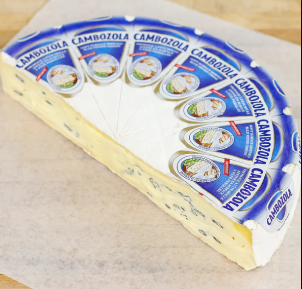 A cross between Camembert and Gorgonnzola, Cambozola cheese is a triple cream, brie-style blue with savory, nutty flavour and undertones of sweetness.