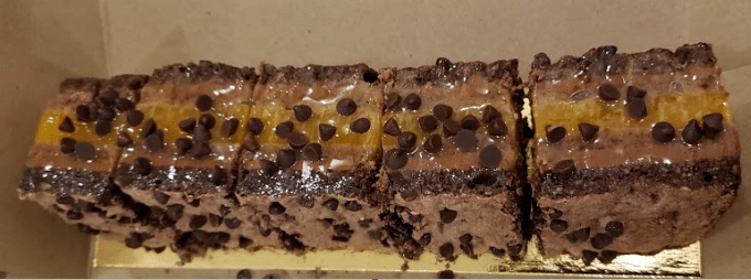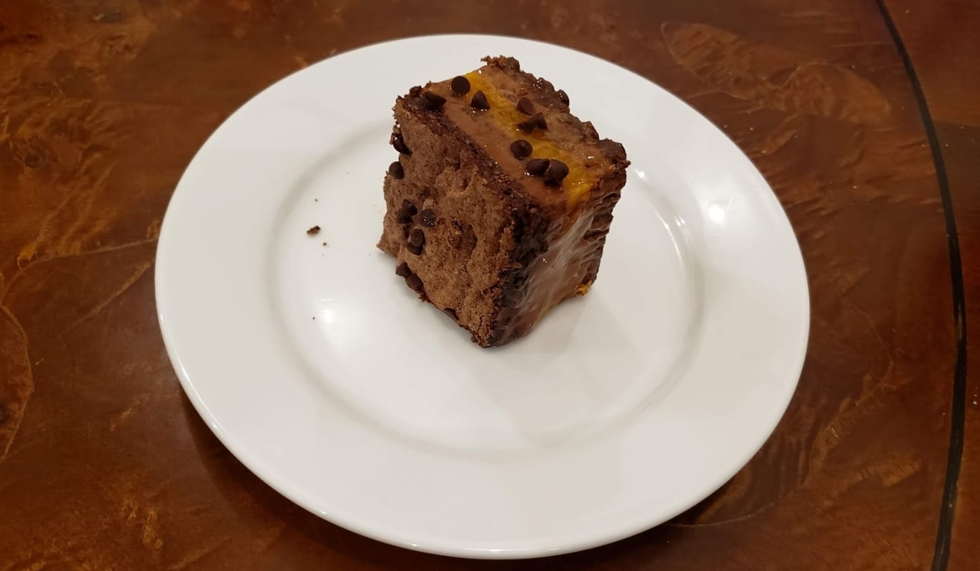 Un gâteau au chocolat étagé, glacé aux fruits de la passion et aux pépites de chocolat.