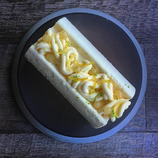 Bûche composée d'une mousse au chocolat blanc Opalys et mélilot, crème aux agrumes, gâteau moelleux au citron.