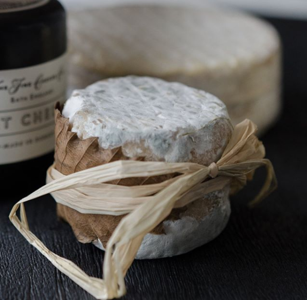 Son intérieur est moelleux et dense, avec sa croûte duveteuse et tachetée soigneusement attachée dans une feuille de châtaignier.