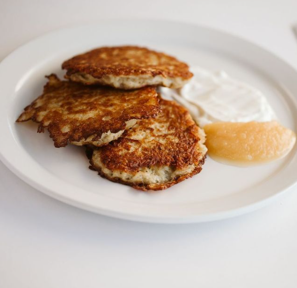 Homemade potato latkes served with a dollop of sour cream and applesauce.
