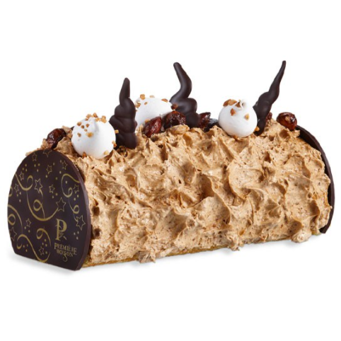 Biscuit roulade imbibé d’un sirop à la noisette parfumé au Frangelico, roulé et recouvert de crème au beurre pralinée.