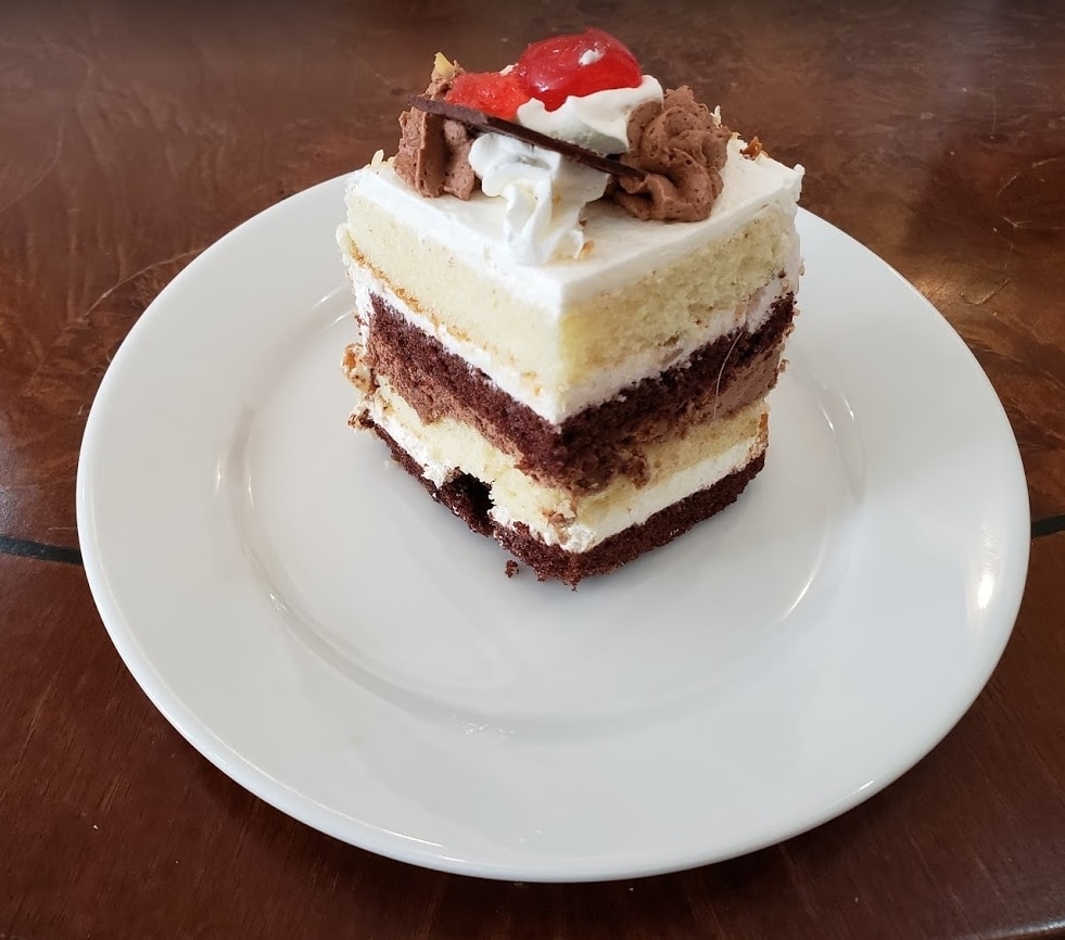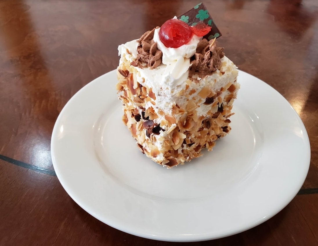Gâteau étagé avec de la crème à la vanille à l'intérieur et sur le dessus, décoré d'amandes grillées, de chocolat et de cerises confites.