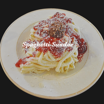 C'est le régal préféré en Allemagne. La glace à la vanille est pressée sous forme de nouilles, garnie de sauce aux fraises maison, de chocolat blanc rapé et d'une boule de noisettes au chocolat.