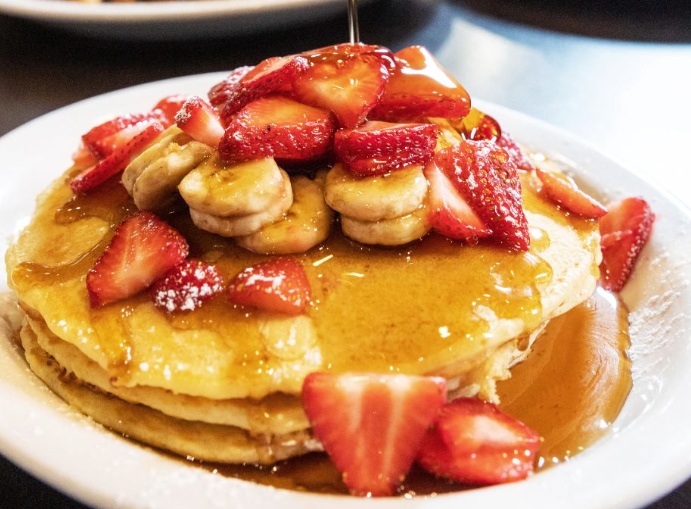 Délicieuses crêpes empilées aux fraises et aux bananes.