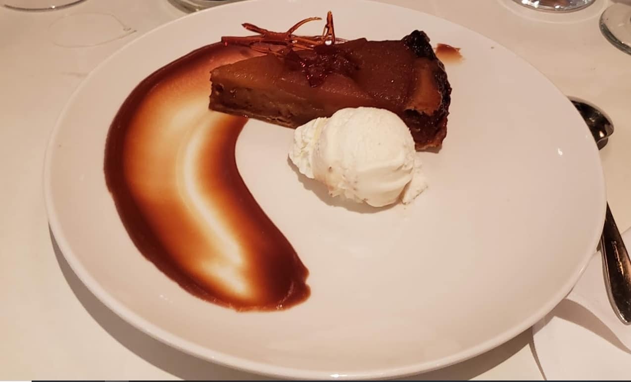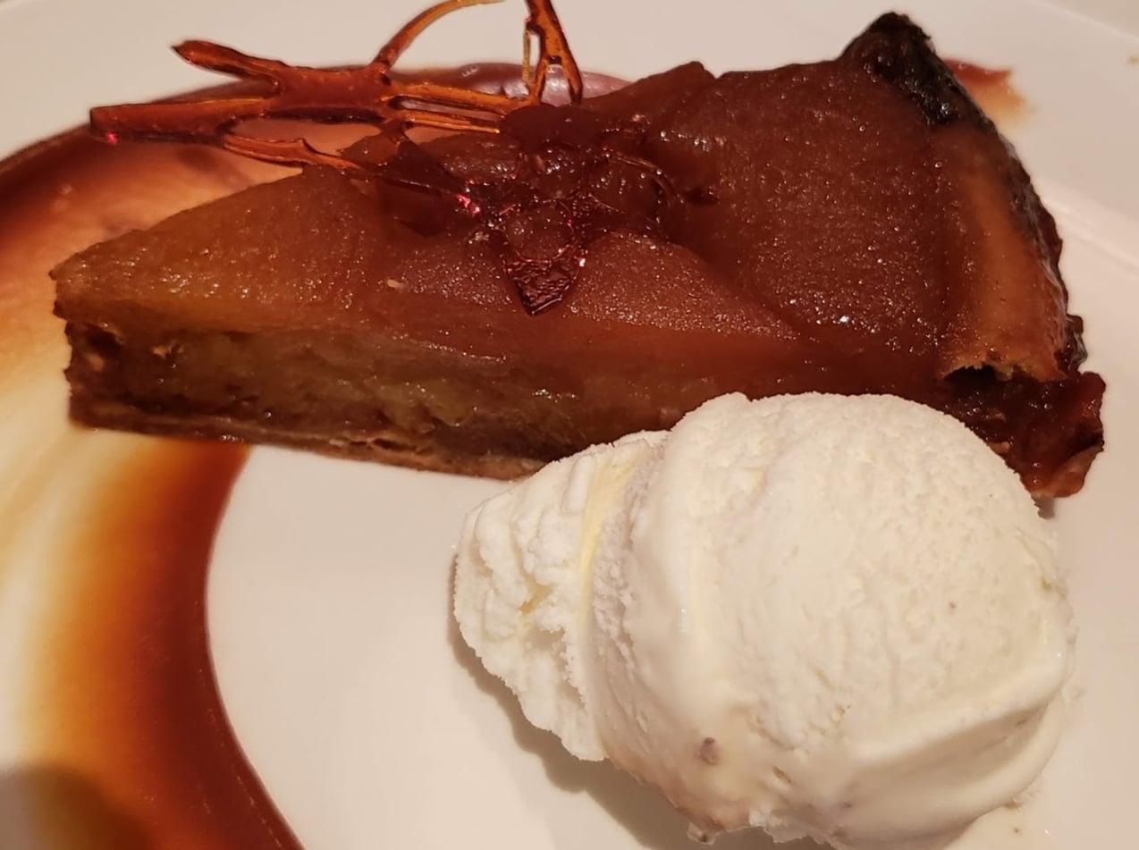 Un gâteau dans lequel les pommes sont caramélisées dans du beurre et du sucre avant que la tarte ne soit cuite (à l'envers).