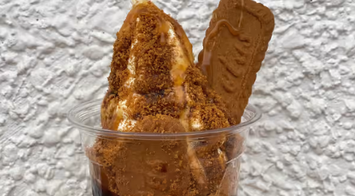 Vanilla soft serve layered with Biscoff crumbles and Hot Caramel Fudge, then topped with Coffee syrup and 1 biscoff biscuit.