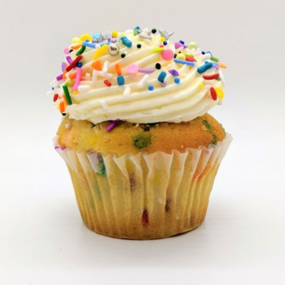 Baked vanilla cupcake with confetti candies inside. Vanilla frosting and festive candies!