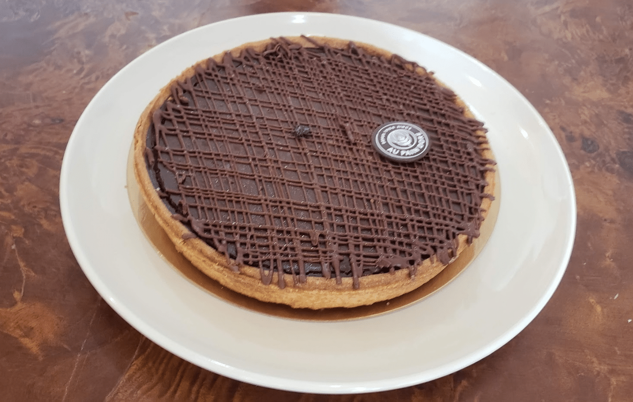 Thin crusted pie with chocolate ganache.