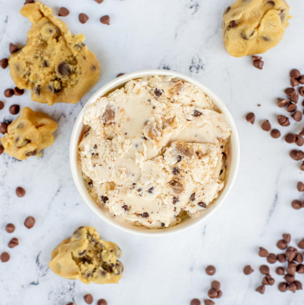 Crème glacée à la vanille avec des morceaux de pâte à biscuits aux pépites de chocolat.