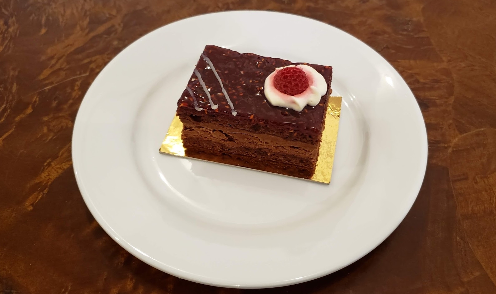 Gâteau au chocolat étagé avec une garniture à la framboise.