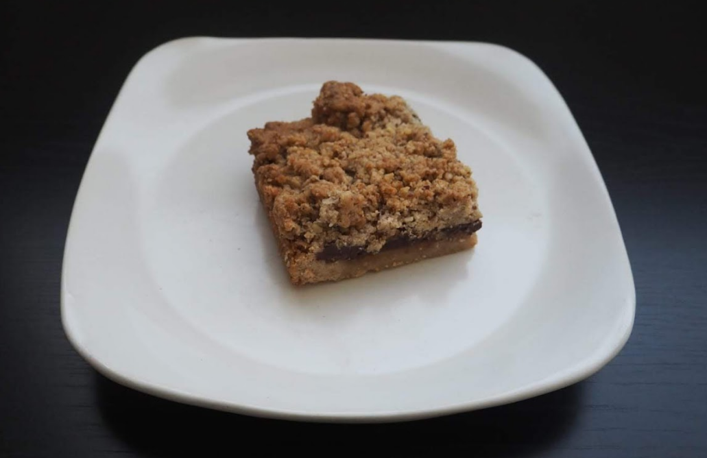 Un carré avec une garniture de pâte à base de dattes et des crumbles blonds sur le dessus.