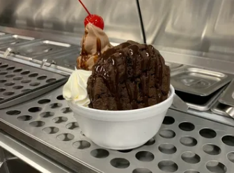 Swirls Chocolate Soft Ice Cream with 2 Double Chocolate Cookies, Hot Fudge, Whipped Topping and a Cherry