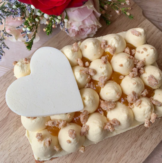 This package contains our 2 to 4 portion Mango Passionfruit cake, with vanilla cake, mango ganache, passionfruit jelly, topped with a white chocolate heart and a lemon and white chocolate crumble, alongside a beautiful bouquet of fresh roses.