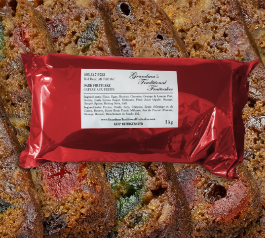 This Port infused dark, dense and delicious Christmas fruitcake is flavoured with spices, cherries, raisins, molasses, dark brown sugar and orange and lemon peel. No nuts. All our fruitcakes are made with fresh butter and eggs.