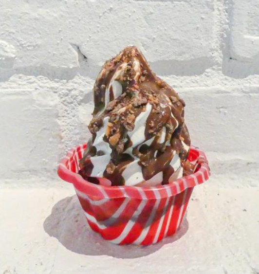 Soft ice cream with homemade vegan chocolate coulis.