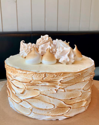 Elderflower cake, elderflower buttercream, lemon curd, toasted meringue décor.