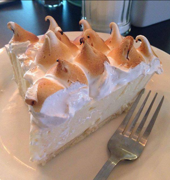 Un caillé de citron acidulé surmonte la pâte feuilletée, avec de délicats pics de meringue au-dessus.