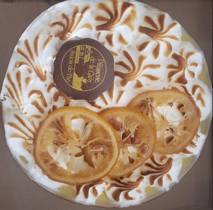 Tarte cuite au four, composée d'une pâte brisée, d'une garniture de crème anglaise au citron et d'une meringue moelleuse.