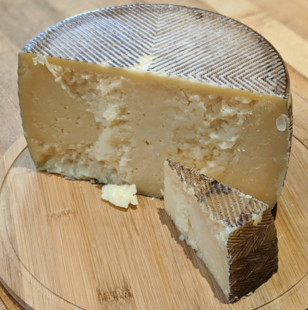 Recognizable by it's destinctive wax rind patterning. It has a fruity, nutty, and tangy flavour that goes great on a cheese board.