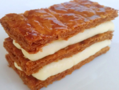 Pâte feuilletée caramélisée à la crème pâtissière à la vanille.