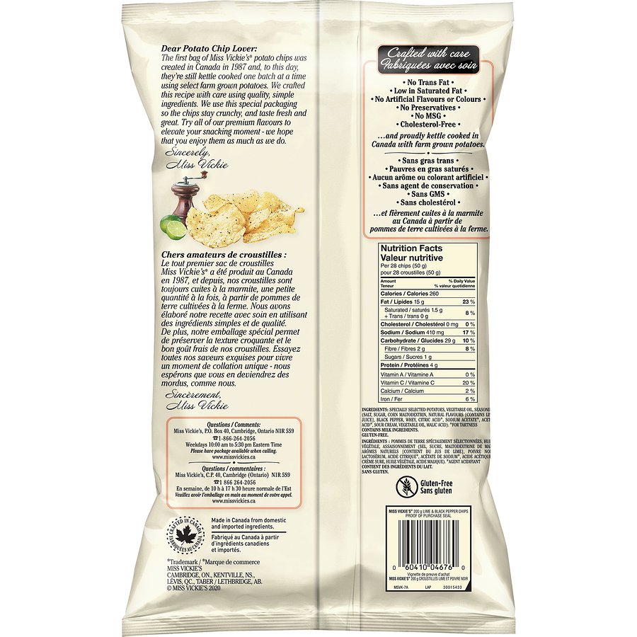 If you love crunch, you’ll love Miss Vickie's Lime & Black Pepper flavour kettle cooked potato chips! A zesty lime flavour combined with black pepper for a gourmet snack experience!This lime-and-pepper flavour combination is commonly used as a base for a marinade or a fancy beverage, and the flavours translate perfectly on kettle cooked potato chips. But don't take our word for it, grab a bag and indulge in the gourmet combination yourself!Miss Vickie's Lime & Black Pepper flavour kettle cooked potato chips have no trans fat, are cholesterol-free, and are low in saturated fat per 50 g serving. No artificial flavours or colours. No preservatives, and no MSG!