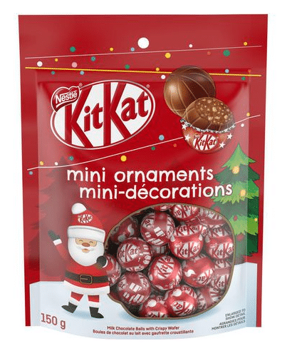 These irresistible milk chocolate and crunchy wafer balls are individually wrapped and feature three different festive designs. With the perfect chocolate to wafer ratio, just like your favourite KITKAT bar, wrapped up like festive holiday ornaments!