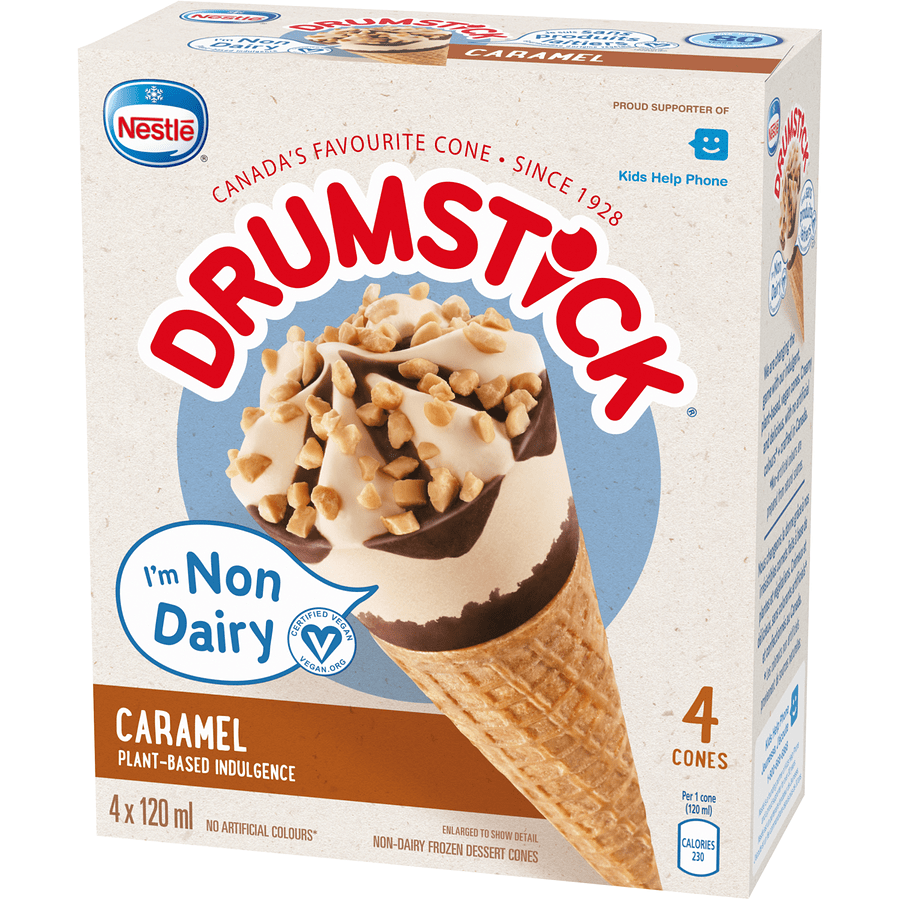 Now here’s a real game-changer. NESTLÉ DRUMSTICK Non-Dairy Caramel (4 x 120 ml) features our new plant-based vegan cone, filled with creamy caramel non-dairy frozen dessert, topped with a delicious dark-chocolatey drizzle and our signature crunchy peanuts. Crafted in Canada, these indulgent plant-based, vegan cones are made without artificial colours*. Proudly raise your cone to DRUMSTICK plant-based goodness!; *Non-artificial colours are prepared from natural sources.Non-dairy caramel frozen dessert in a plant-based, vegan cone, topped with a dark-chocolatey drizzle & chopped peanutsPlant-based and vegan with all the delicious tastes of our classic coneMade without artificial colours* and crafted in Canada230 calories per 120 ml coneDRUMSTICK has been the original sundae cone for over 80 years