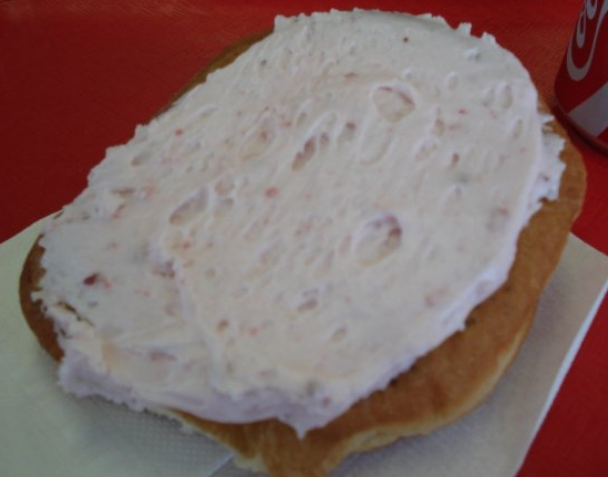 A fried sweet roll in a spiral shape, glazed with sweet pink icing