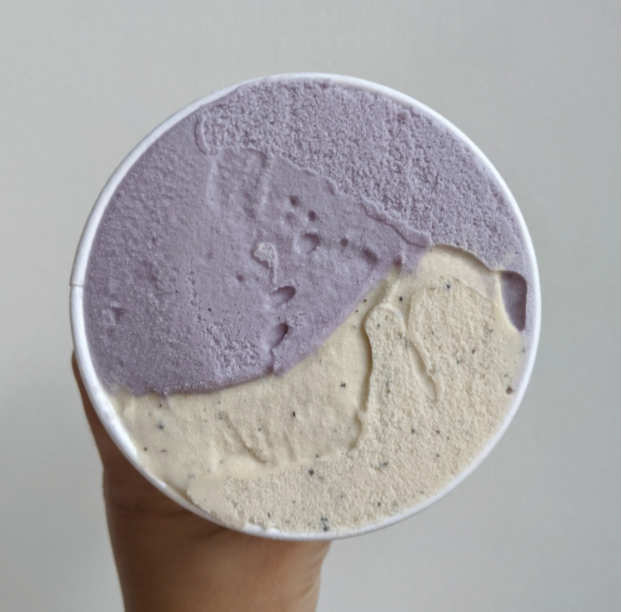This ice cream is a marble of two flavours: a naturally dyed purple honey & lavender ice cream, and a speckled earl grey ice cream. Aromatic notes of floral, bergamot citrus, and black tea paired with fresh cream.