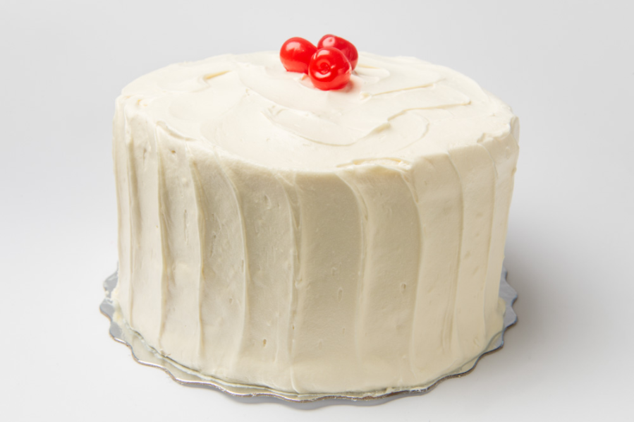 Dark chocolate cake and cream cheese frosting. Topped with a sugared red rose.