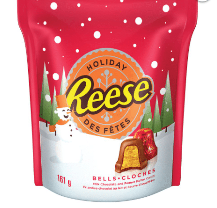 REESE peanut butter and chocolate bells are individually wrapped in festive foils. They are perfect for candy dishes, sharing and gifting.