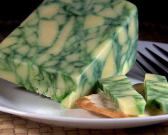 Réservé à l'origine aux occasions festives, ce fromage est désormais disponible toute l'année. Ses merveilleuses teintes et veines vertes lui viennent de l'inclusion de la sauge lors de la production. La saveur presque mentholée convient bien à n'importe quel plateau de fromages.