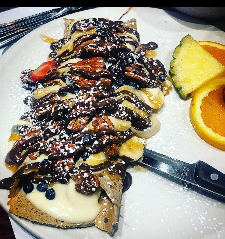 Des crêpes avec des fraises, de la banane et un filet de chocolat sur le dessus.