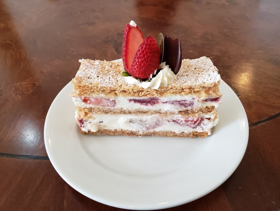 Pâte feuilletée remplie de crème fouettée et de fraises.