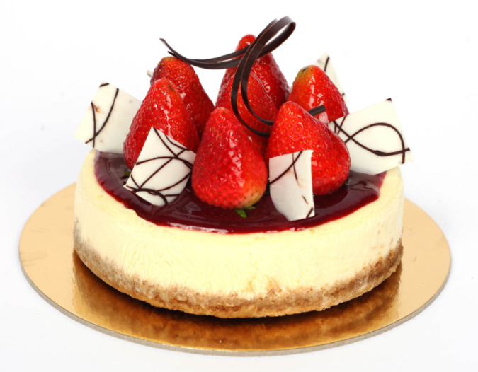 A graham crumb crust, creamy baked cheese cake with a strawberry coulis.