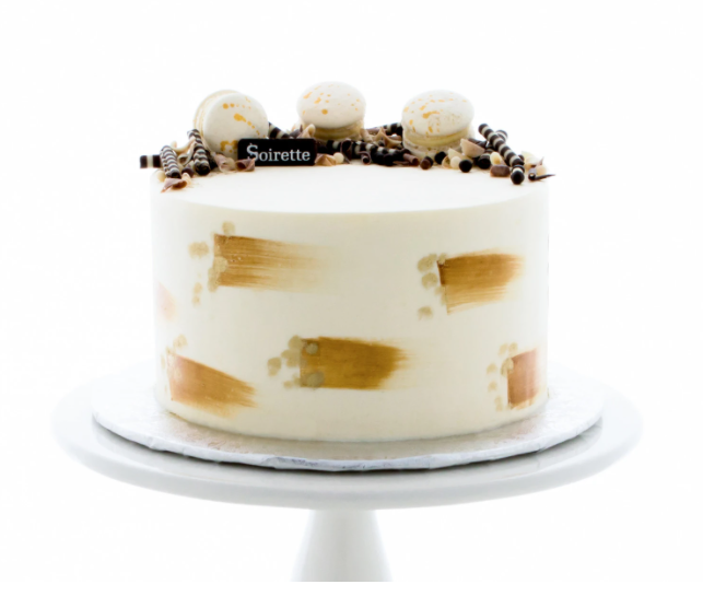 Delicious coffee cake filled with dark coffee swiss buttercream, tiramisu mousse and Kahlua syrup. Decorated with a chocolate, gold dust, dark chocolate glaze and mini macarons.