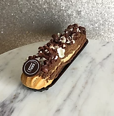 Choux pastry filled with whipped dark chocolate, Kahlua and mascarpone ganache. Topped with an espresso crackling and white & dark chocolate couverture curls.